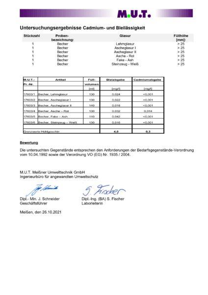 Hier die Laborberichte meiner verwendeten Glasuren – bezüglich ihrer Eignung für den Kontakt mit Lebensmitteln. Muss dich nicht so interessieren. Ich brauche es hier, falls mal das Ordnungsamt am Marktstand kontrolliert. Und ja liebe Hobbytöpfer – wenn ihr Ware die mit Lebensmitteln in Berührung kommen darf an Kunden abgebt – ihr braucht das auch.